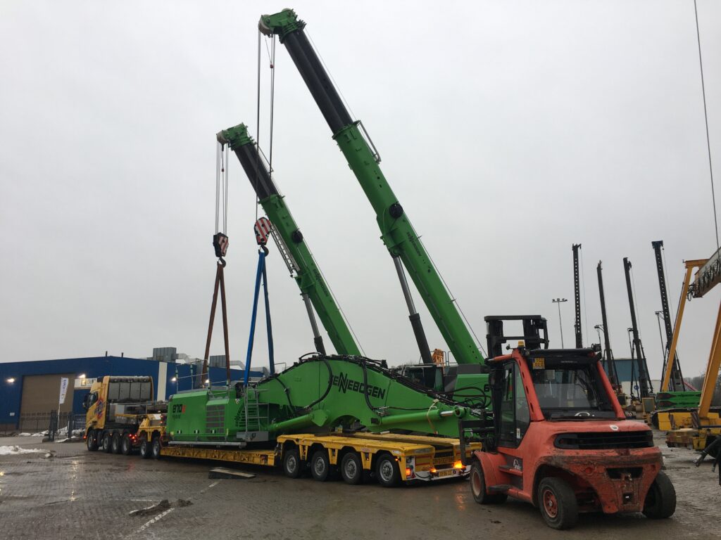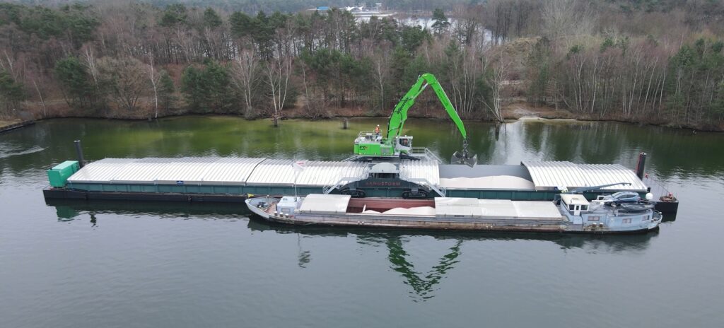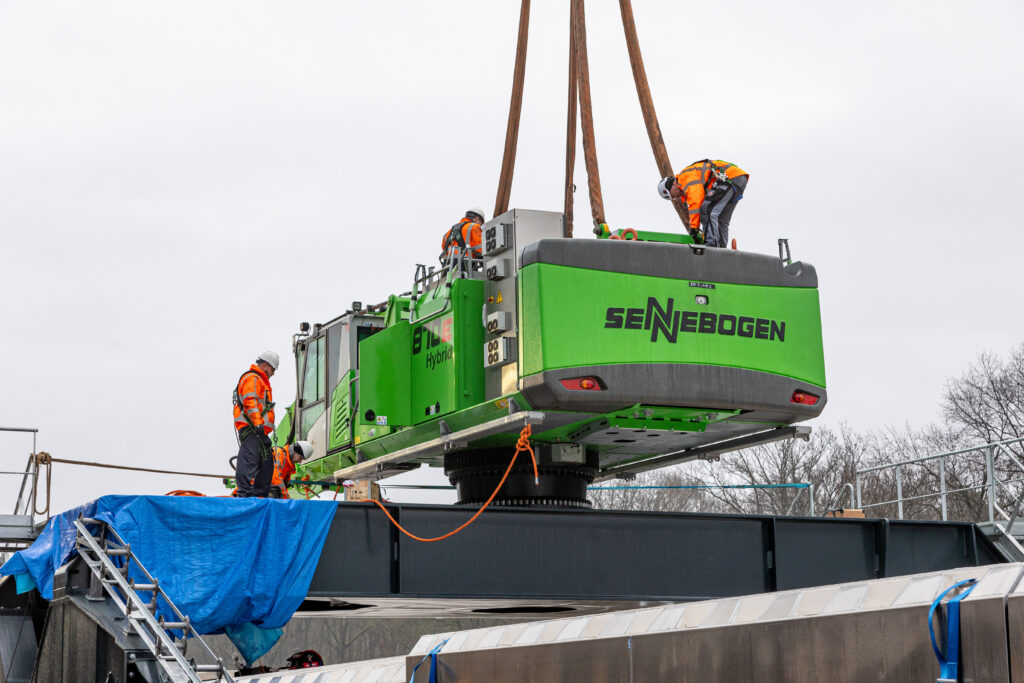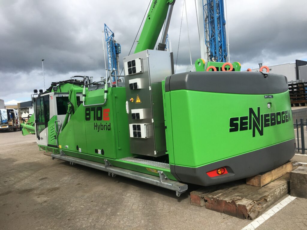 Een bijzonder project: een volledig elektrische Sennebogen 870e met een speciaal ontworpen onderwagen. Deze kraan is op een vrachtschip gemonteerd en ingezet voor het overslaan van zand.