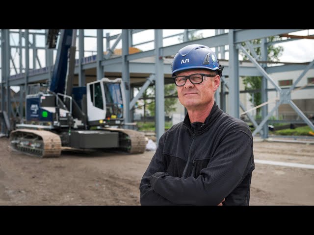 De elektrische Sennebogen 653 van MHM Montage bouwt mee aan de bouw van een productiehal…