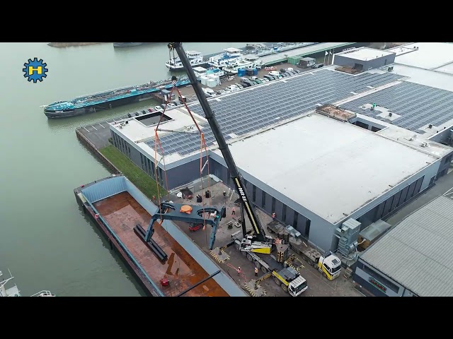 Het plaatsen van de onderwagen van de Sennebogen 870 op het schip.